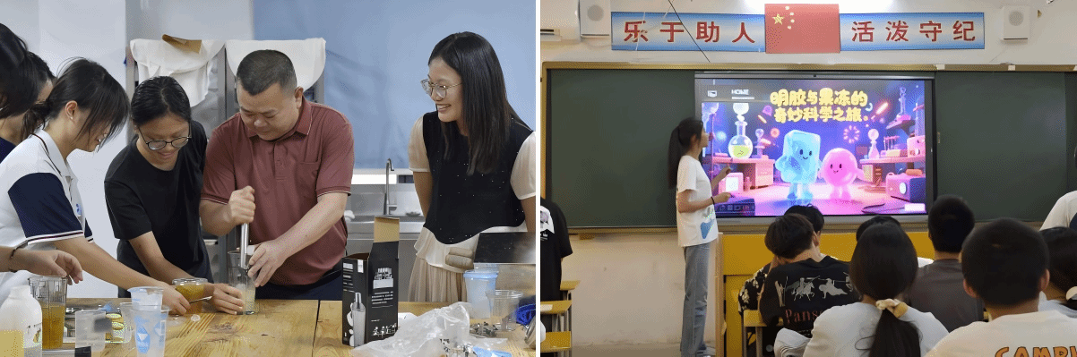 6月28日至7月3日,服务团走进丰顺县职业技术学校,与烹饪241班开展为期一周的结对义教。活动融合理论讲解与动手实践:揭秘“美拉德反应”并制作蛋挞,探索食物化学奥秘;动手制作果冻,感受食品添加剂与明胶的科学应用;科普酸碱食物营养并制作柠檬茶;创作非遗种子画、联合开展科普宣传等。丰富的课程设计有效激发了学生的学习兴趣。
