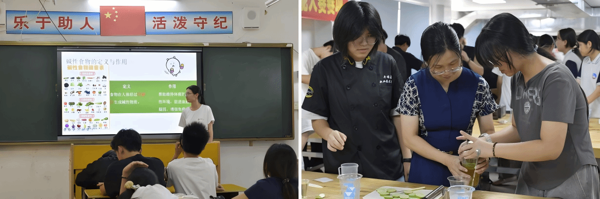 服务团成员吴婉敏从营养学角度讲解酸碱性食物的定义与价值,强调合理摄入酸碱性食物对维持身体健康的重要性。随后,在酸碱平衡饮食指南引领下,学生动手制作暴打柠檬茶,化身“小小饮品师”,课堂充满欢声笑语。