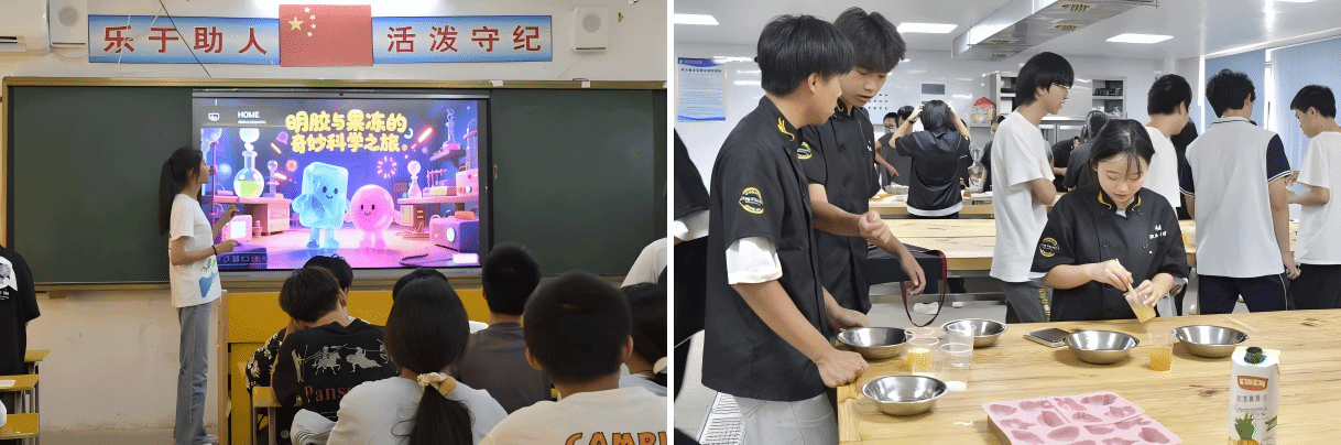 服务团成员陈嘉敏讲解明胶原理与添加剂知识,结合违法案例敲响食品安全警钟。她引导学生思考“你想为果冻设计什么新口味”,从而设计果冻新口味,并指导学生在实训楼动手制作,真切感受“舌尖上的科技”,激发科学探索热情。
