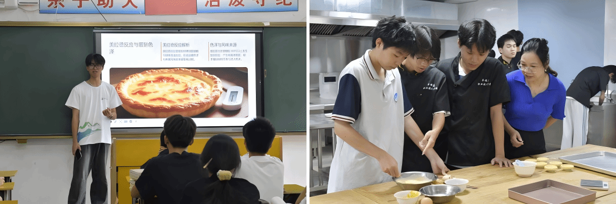 服务团成员陈梓帆同学以蛋挞制作为例,通过生动讲解和趣味短视频,科普了美拉德反应在烹饪中的奇妙应用。随后,学生们在服务团成员的指导下走进实训楼,亲手参与蛋挞制作。从调配蛋挞液、观察烘烤变化,到最终品尝成果,每一个步骤都成为知识应用的生动课堂,让美拉德反应等科学原理在实践中得到深刻理解和巩固。